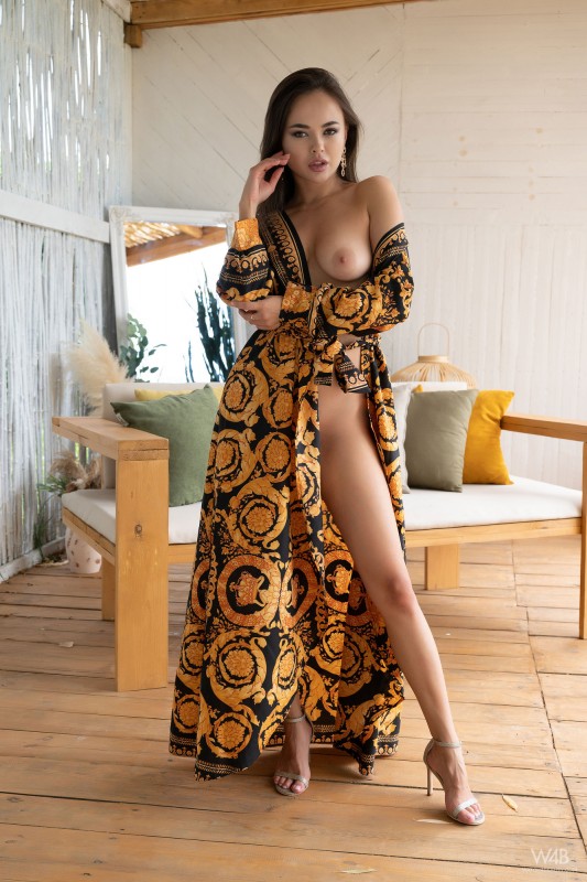 Распахнув на себе легкий шелковый халат и выставив на показ крупные упругие сиськи, голая экзотическая красотка с бритой сочной пиздой эротично позирует перед камерой всем телом, охотно выпячивая крупным планом свою крепкую задницу с торчащими между булками темными половыми губами.