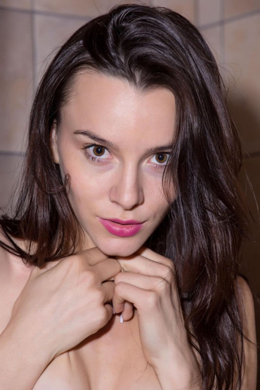 Игриво виляя своей аппетитной нежной попочкой, стройная голая брюнетка бесстыже светит своими возбуждающими прелестями в ванной комнате. Нежно лаская руками обнаженное тело, развратная дамочка с маленькой грудью высоко задирает длинные ноги и выставляет на показ бритую промежность.