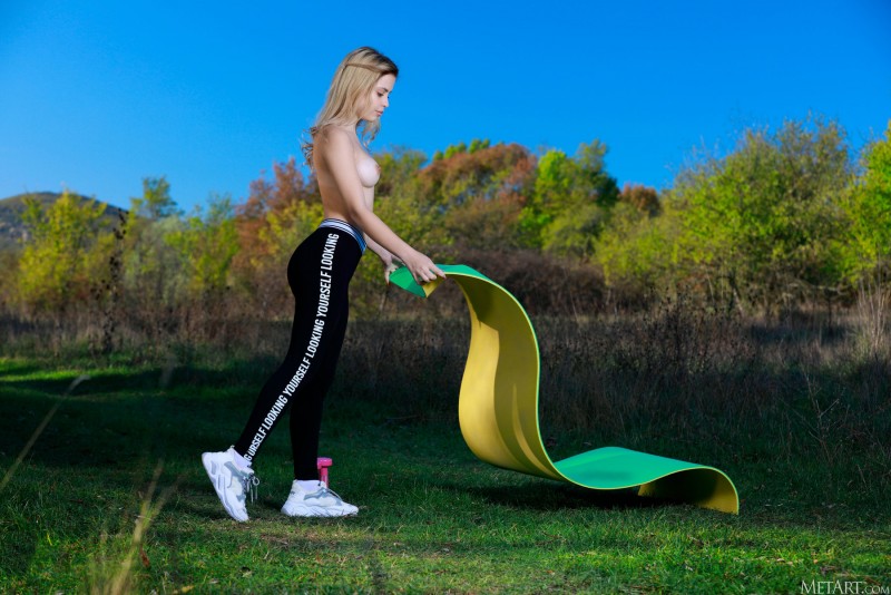 Энергично выполняя упражнения и постепенно стягивая с себя обтягивающую одежду, молодая спортивная детка с красивой подтянутой фигурой эротично позирует голышом на природе и с разных ракурсов демонстрирует на камеру свои упругие титечки и раскрытую бритую промежность.