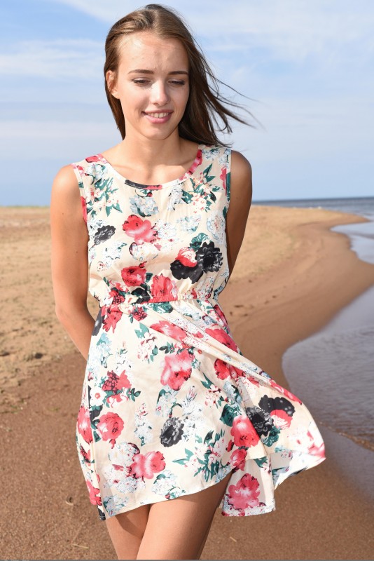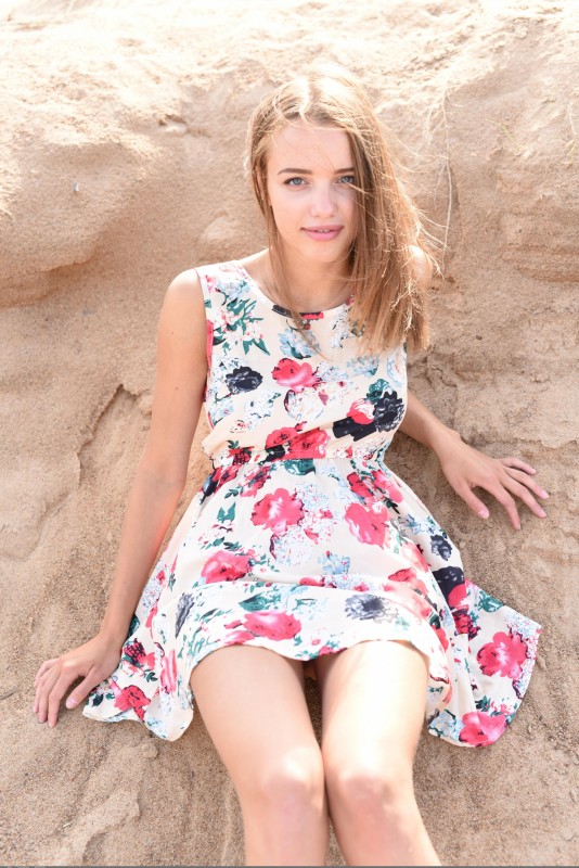 Молодая симпатичная девушка без стеснения снимает перед нами свое легкое летнее платье без трусиков и, расслабленно греясь на солнышке, с удовольствием загорает голышом, с разных ракурсов подставляя вперед то свои сочные упругие сиськи, то гладкую милую писечку.