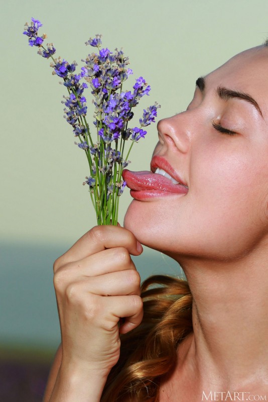 Позируя перед камерой на фоне большого лавандового поля, сексуальная загорелая девушка с красивой грудью и упругой попой чувственно ласкает руками свою нежную горячую кожу и, постепенно возбуждаясь от своих действий, интригующе раскрывает перед нами свою гладкую промежность с узкой влажной дырочкой.