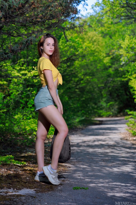 Решив сделать привал и сбросив с себя тяжелый рюкзак, молодая туристка в топе и коротких шортиках устроила перед нами настоящий стриптиз прямо на природе. Нежно лаская руками свои постепенно оголяющиеся прелести, стройная шатенка с упругими титечками плавно опускается на землю и, соблазнительно раздвинув красивые ножки, раскрывает на камеру потрясающий вид на свою бритую сочную письку.