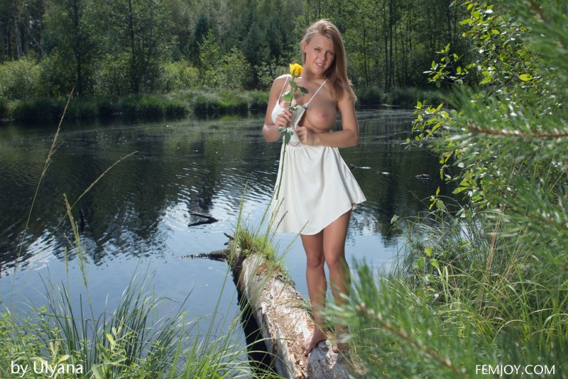 Отдыхая на берегу озера, аппетитная деревенская девка медленно снимает с себя короткое платьице и развратно трясет перед камерой своими огромными буферами. Уверенно соблазняя своими формами, сочная бабёнка не стесняется также выпятить крупным планом красивую попочку с бритой розовой писькой между булками.