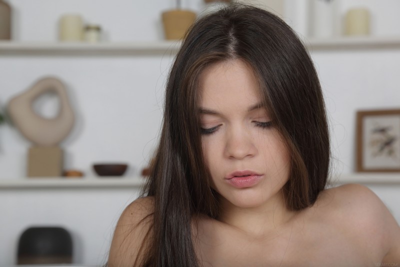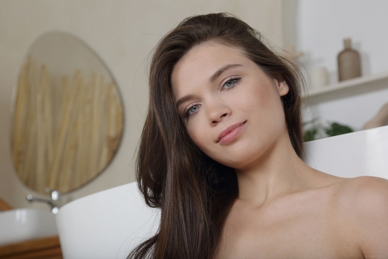 Эротично сняв с себя скрывающий прелести халат, нежная обнаженная девушка с натуральной грудью развратно позирует перед камерой в ванной комнате. Страстно лаская себя руками, игривая детка похотливо раскрывает между ног свою бритую розовую киску, а затем с удовольствием погружается в наполненную горячей водой ванну.