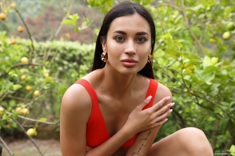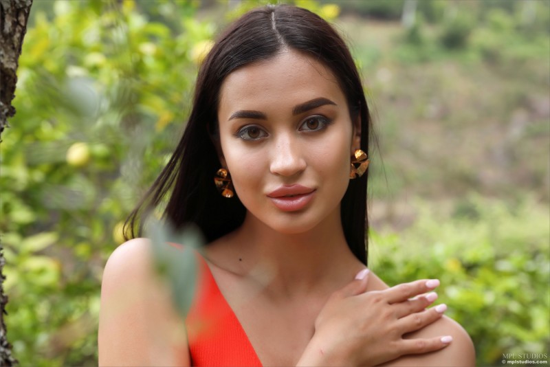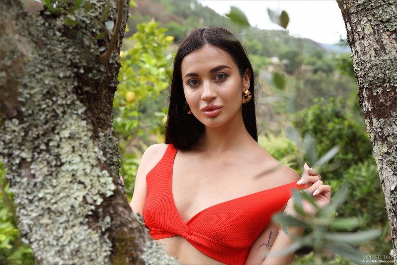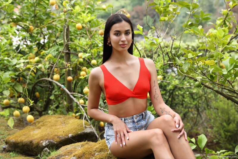 Эротично позируя на природе, жгучая брюнетка постепенно снимает с себя джинсовые шортики с лифчиком и нежно поглаживает руками свои оголившиеся части тела. Безумно возбуждающе извиваясь и выгибаясь всем телом, сексуальная красотка с аккуратными титечками старается как можно шире раздвинуть перед камерой свои длинные ноги и в мельчайших подробностях показать любому желающему бритую киску.