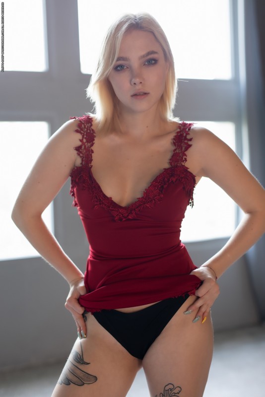 Медленно стянув с себя обтягивающее красное платье, сексуальная дерзкая блондинка оголила перед камерой свое соблазнительное тело с татуировками на стройных ножках. Чувственно извиваясь на диване, горячая штучка с упругими сиськами и попой умело принимает для нас самые откровенные позы и интригующе засвечивает мельком свою бритую маленькую киску между ног.
