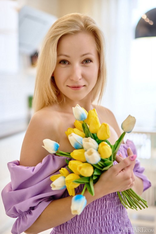 Эротично позируя на светлой просторной кухне и кокетливо стягивая с себя платье, нежная блондинка медленно оголила свои плоские тити с маленькими острыми сосками, а затем устроилась перед нами на столе с широко раскрытой рогаткой и, выпятив ее вперед на камеру, без стеснения показала там бритую письку.