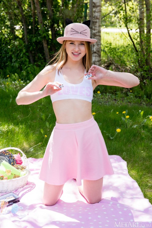 Устроив себе пикник и кокетливо снимая с себя симпатичный розовый наряд, нежная девушка с аппетитной попкой полностью оголилась на природе и, развалившись на земле с высоко задранными ногами, раскрывает перед нами шикарный вид на бритую сладенькую киску и анус.