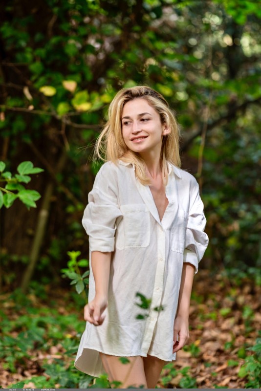 Плавно двигаясь перед камерой и легко скинув со своего худенького тела расстегнутую рубашку, обнаженная нимфа интригующе светит плоскими титечками где-то в лесу. Совершенно ничего от нас не скрывая, игривая блондинка игриво вертит в разных позах своей голой подтянутой попой и возбуждающе раскрывает между ног бритую киску с сочными розовыми губами.
