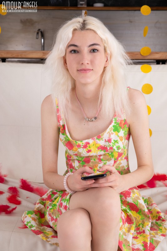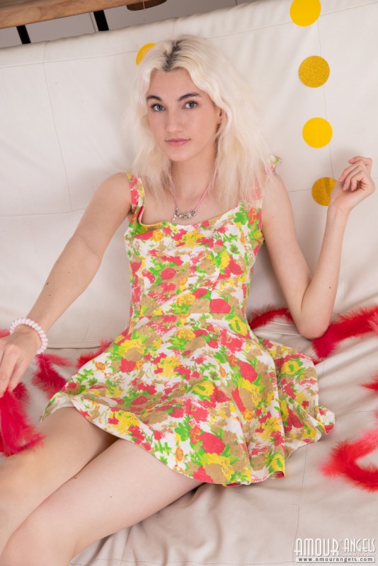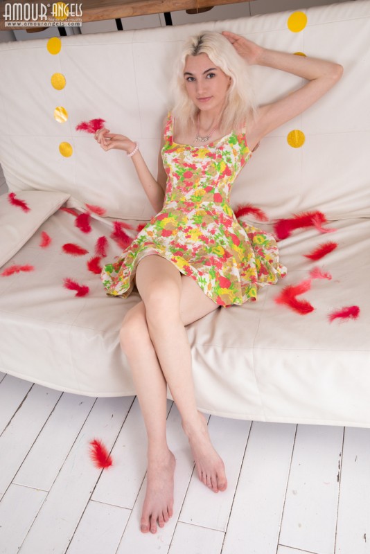 Кокетливо стянув с себя яркое платьице и белые трусики, молодая плоская блондинка с миниатюрными прелестями развратно раздвигает худенькие ноги на диване и в самых необыкновенных позах демонстрирует на камеру свою бритую промежность и ее розовую письку с торчащими большими губами.
