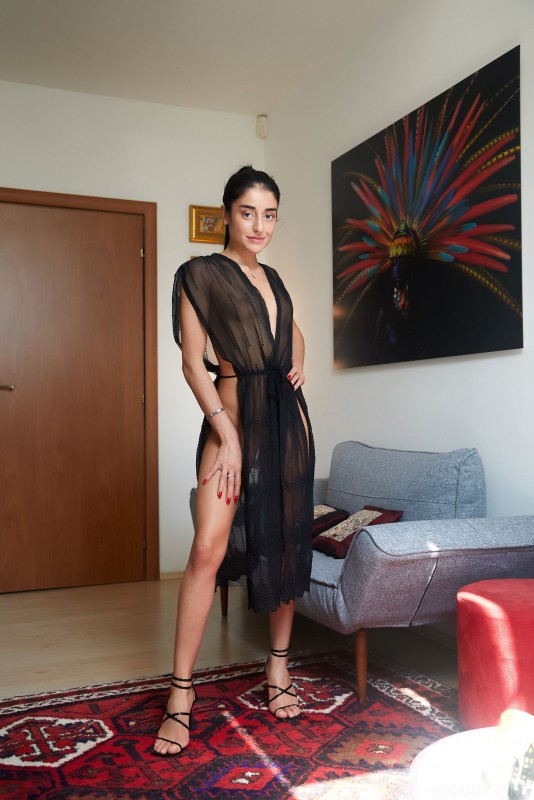 Возбуждающе медленно сняв с себя откровенный прозрачный халат и оголив под ним свои миниатюрные титечки, похотливая смуглая брюнетка лежит перед камерой с широко раздвинутыми ногами на диване и бесстыже теребит сочные половые губки у бритой письки своими шаловливыми пальцами.