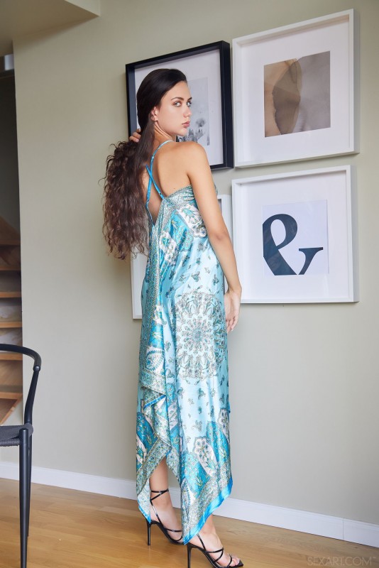 Страстно сорвав с себя перед всеми длинное платье, горячая брюнетка с маленькими титечками перепробовала разные откровенные позы верхом на стуле и с удовольствием раскрыла шаловливыми пальцами бритую пизду, показывая между розовыми губками узкую нежную щёлочку.