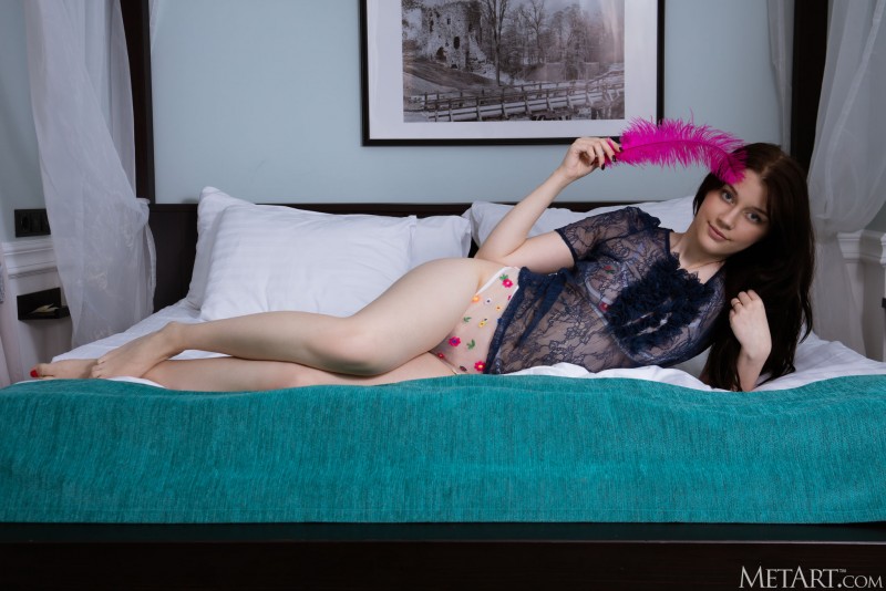 Кокетливо лаская свою гладкую нежную кожу большим пером и постепенно снимая с себя одежду вместе с нижним бельем, голая брюнетка с натуральными сиськами и аппетитной мягкой попой расслабленно лежит перед камерой на кровати и между раздвинутыми ногами засветила свою волосатую письку.