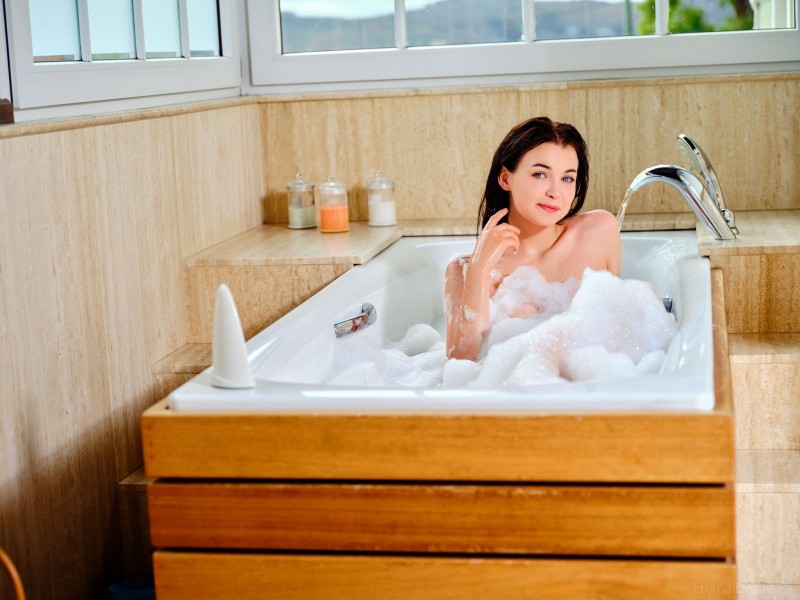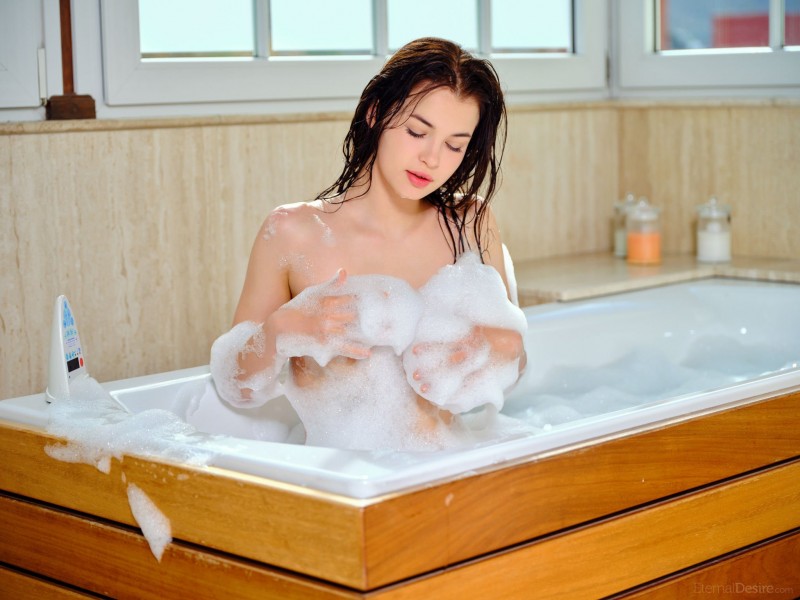 Игриво засвечивая из пены свои прелести, голая брюнетка с красивым телом расслабленно нежится в горячей наполненной ванне. Затем молодая детка вышла из воду и, с разных ракурсов демонстрируя нам свое мокрое скользкое тело с нежными сиськами, развратно раскрывает в промежности розовую бритую письку.