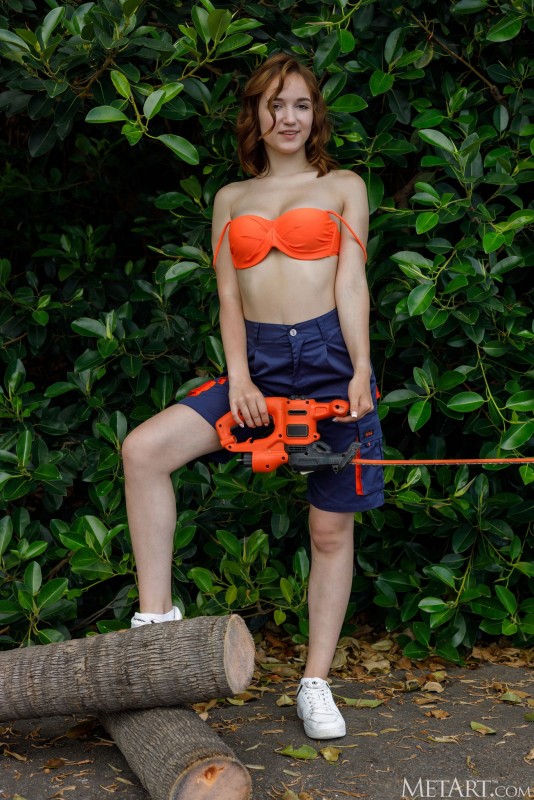Хорошенько поработав в саду пилой и с удовольствием сняв с себя всю одежду, сочная девица во всей красе демонстрирует нам свои голые упругие буфера, а затем развратно позирует перед камерой с широко раздвинутыми ногами и крупным планом выпячивает вперед свою бритую пухлую пиздёнку.