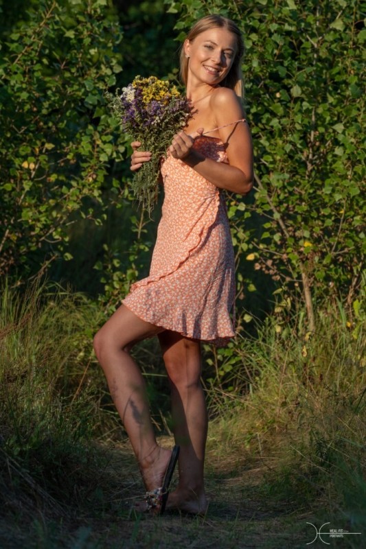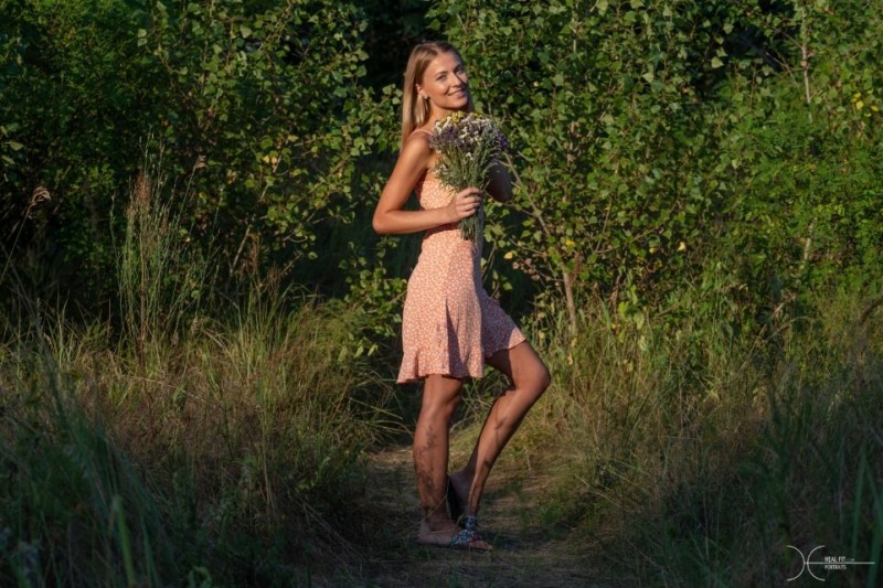 Быстро сняв с себя короткое летнее платье, развратная дамочка с подтянутым сексуальным телом игриво вертит перед работающей камерой своей голой крепкой жопой на природе и, страстно извиваясь в разных позах прямо на земле, возбуждающе засвечивает между раскрытыми бедрами свою бритую письку.