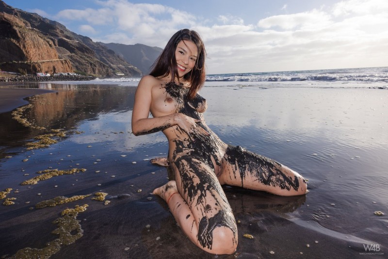 Эротично позируя перед камерой в развратном открытом наряде, сексуальная телка с упругими сиськами и красивой подтянутой задницей измазалась вся в грязи на пляже и, лежа на земле с широко раздвинутыми ногами, с разных ракурсов показывает нам свою бритую темную письку.