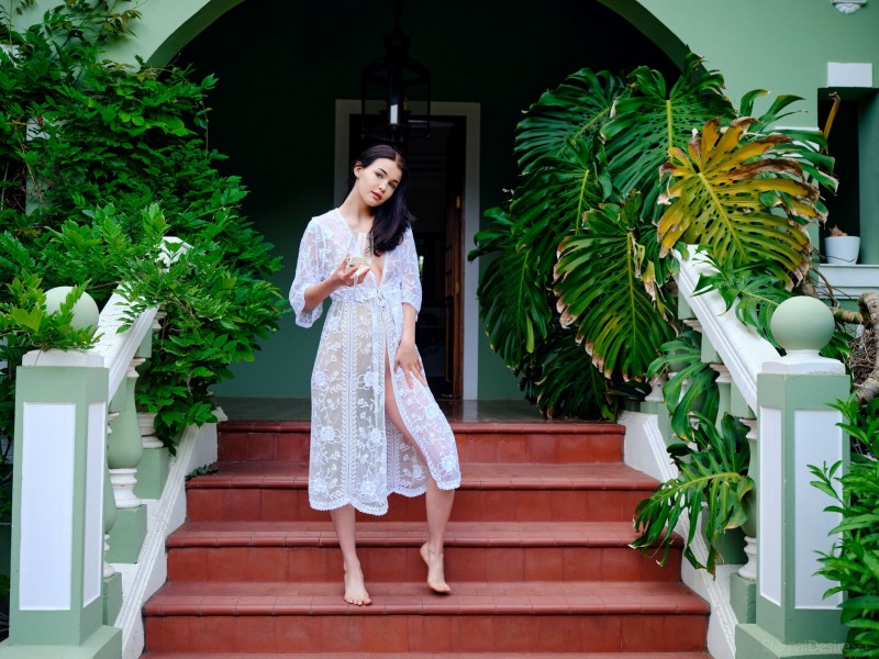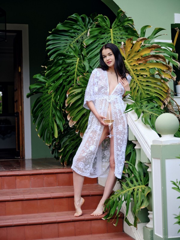 Выйдя из дома на крыльцо и решив шокировать соседей своим выступлением, молодая красивая брюнетка в прозрачном халате кокетливо оголила под ним свое стройное тело с упругими титечками. Нежно поглаживая шаловливыми ручками свою гладкую кожу, развратная девица приглашающе раскрывает на лестнице голую бритую промежность и во всей красе показывает там сочную киску с торчащими розовыми губками.