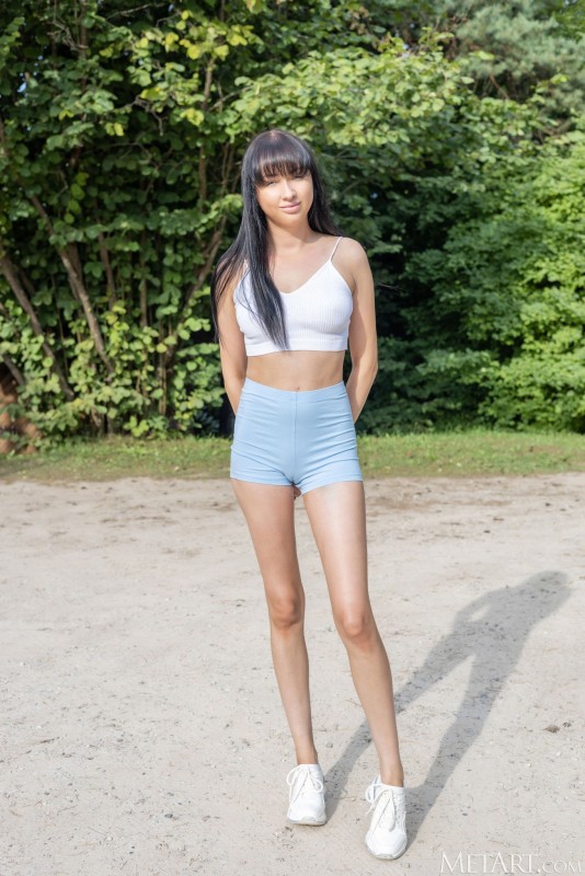 Сделав небольшую разминку на свежем воздухе и тут же начав снимать с себя всю одежду, развратная гибкая брюнетка разделась перед работающей камерой до гола и, энергично изгибаясь на полу в самых откровенных позах, с разных ракурсов показала нам свою бритую письку с интимной стрижкой между ног.