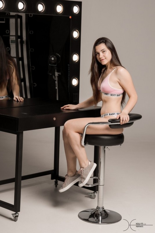 Сексуальная стройная куколка в лифчике и трусах с удовольствием оголила перед камерой свои натуральные упругие тити и попку. Забравшись голышом на маленький столик, развратная девушка как может изгибается на нем в разных позах и возбуждающе засвечивает между раскрытыми бёдрами свою бритую маленькую письку.