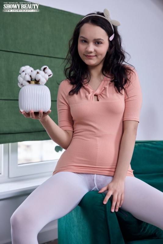 Интригующе медленно приподняв на себе кофточку, развратная молодая девица с упругими сиськами медленно снимает с аппетитных ножек белые колготки, а потом устраивается в мягком кресле и с соблазнительно раздвинутыми ножками вовсю светит бритой темной пиздёнкой.