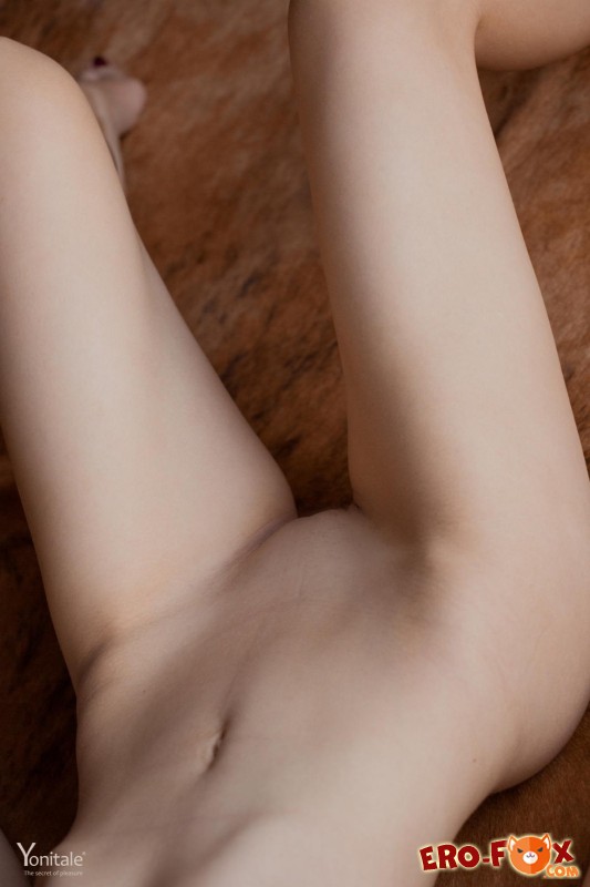 Соблазнительная и немного худая красавица с красивой грудью небольшого размера, полностью разделась, и голая решилась устроиться на шкуре животного лежащей на полу, где она позирует перед камерой. Чередуя разные позы, милашка в чокере демонстрирует маленькую грудь с торчащими сосками, а раздвигая ноги показывает бритую письку.