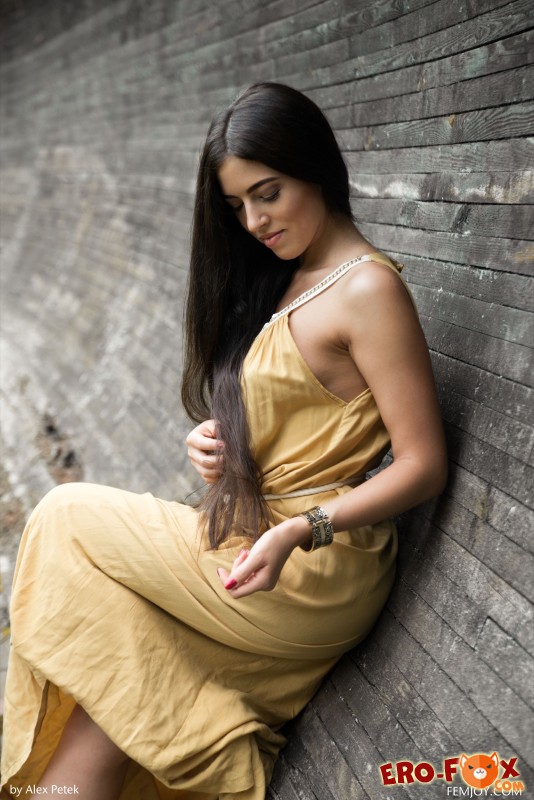 Завораживающе красивая брюнетка с сексуальным телом, оказавшись в старой заброшенной лобке, где начала медленно оголятся, максимально эротично стягивая длинное платье и создавая восхитительные ню фото. Первым делом девушка показывает упругую грудь с возбуждающими сосочками, а после демонстрирует бритую киску, в процессе лаская ее пальчиками.