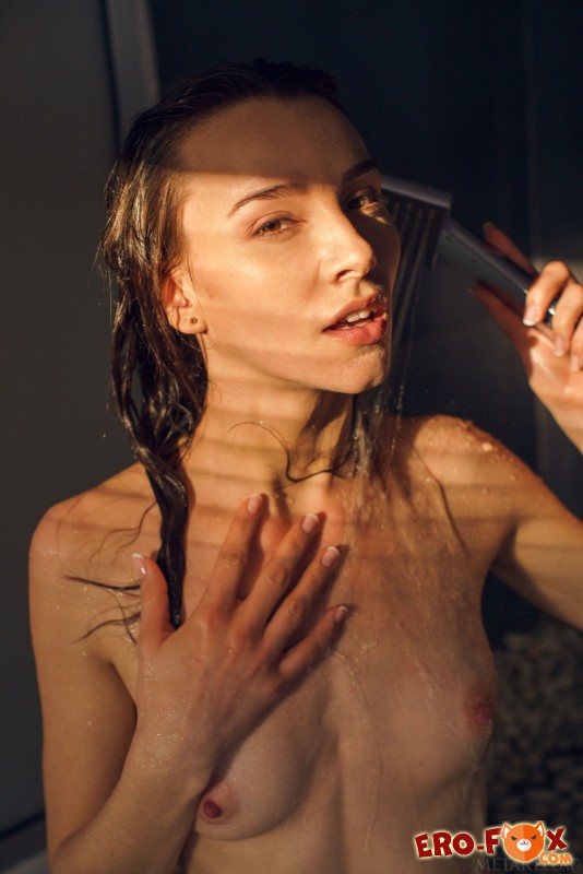 Голая красавица с невероятно возбуждающей фигуркой моется в душе и вся мокрая позирует перед камерой. Стройная девушка с радостью показывает нам все соблазны своего восхитительного тела. Она позволяет взглянуть на маленькую грудь, голую попку, по ягодицам которой стекают ручьи воды. А так же, нам посчастливится увидеть бритую киску, этой очаровательной особы.