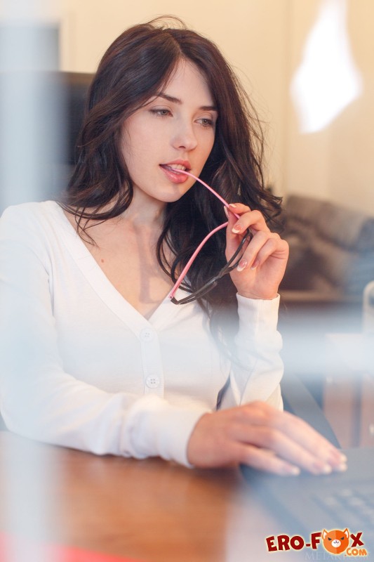 Сексуальная девушка в очках с красивым личиком, сидя за столом, вдруг принялась страстно приоткрывать ротик и медленно снимать блузку с облегающей юбкой. Первым делом возбуждающей милашке удалось показать упругие сиськи, параллельно эротично стягивая трусики. Как только на ней не осталось одежды, можно было рассмотреть бритую письку и плоский животик.