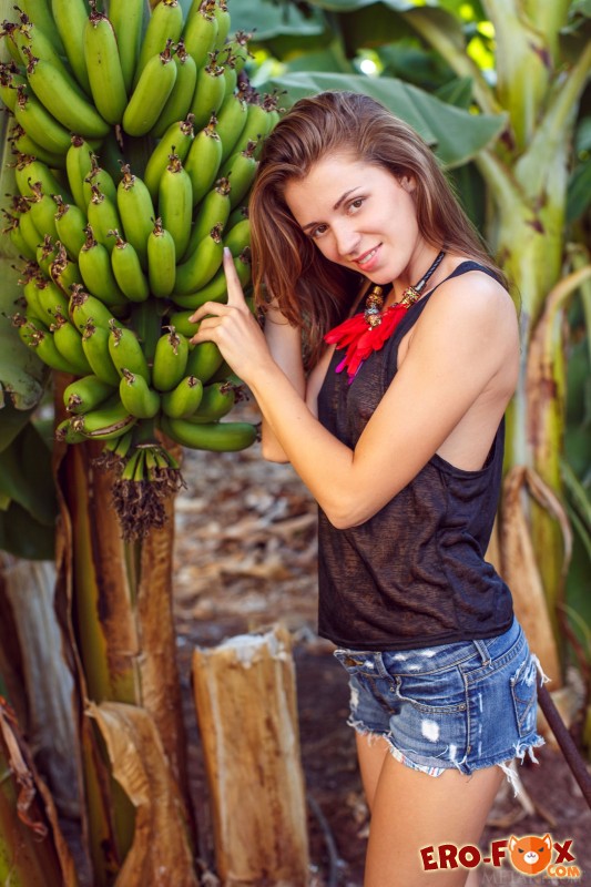 Эротика » Голые девушки » Красотка без лифчика сняла шортики в банановом саду