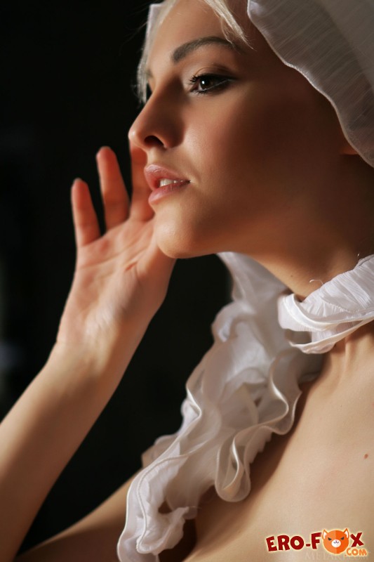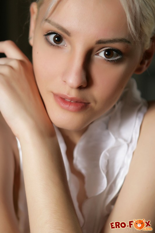 Привлекательная светловолосая модель с красивым выразительным лицом и сексуальным телом, скинув черное боди, принялась эротично позировать в чулках на стульчике. Максимально грациозно выгибаясь и страстно сжимая маленькую грудь руками, красавица подчеркивает ее размеры, параллельно раздвигая промежность, засвечивая гладко выбритую киску.