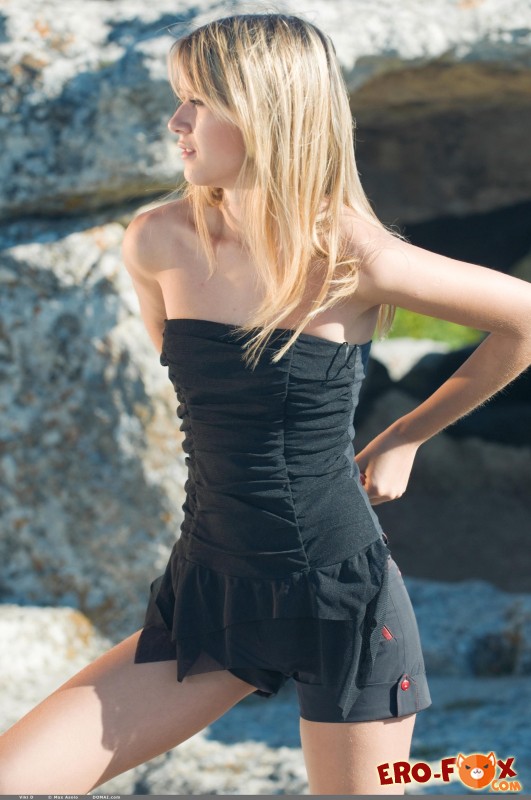 Молоденькая милашка со стройной фигурой и маленькими сиськами, сняв блузку и коротенькие шортики, берется эротично позировать на природе, показывая письку с волосатым лобком. Присаживаясь на камни, светловолосая сексуальная красавица ощущала наслаждение и мило улыбаясь продолжала выгибаться.