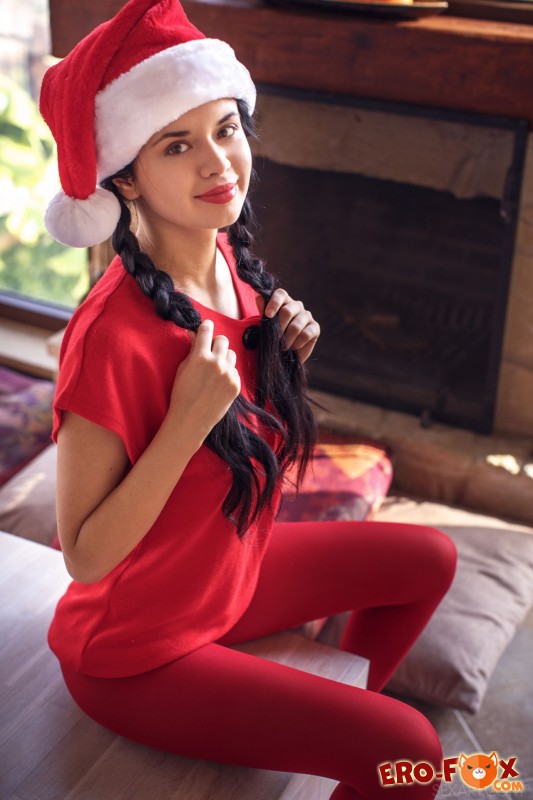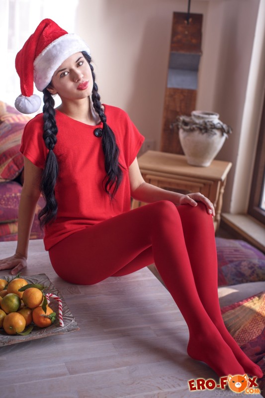 Темноволосая девушка с красивой внешностью и сексуальным телом, нарядилась в красные колготки и новогоднюю шапку с футболкой, принялась эротично позировать и сосать леденец. Уже спустя несколько минут красотка стянула верх, оголяя перед нам маленькие сиськи, а оголившись полностью берется засвечивать гладенькую киску с подтянутой попочкой, продолжая чередовать возбуждающие позиции.