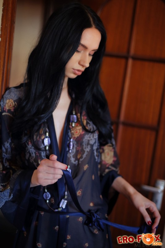 Скинув халатик, единственное что прикрывало сексуальное тело, молоденькая брюнетка начала демонстрировать упругие сиськи, а вставая раком на постели, оттопыривала подтянутую попочку. Грациозно трогая себя руками, красивая девушка не останавливаясь, а чередовала возбуждающие позы, показывая гладко выбритую письку.