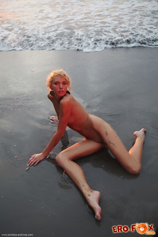 Полностью оголившись, молоденькая худая блондинка начинает эротично позировать на пляже, в процессе ложась на песок и нежась в волнах, намочив сексуальное тело. Строя глазки крошка чередует максимально возбуждающие позы, показывая влажную гладко выбритую письку и маленькую грудью.
