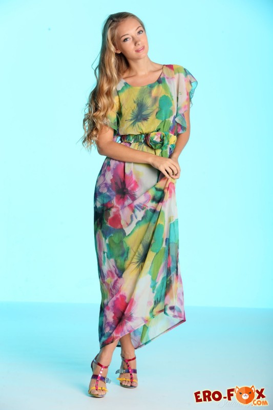 Сексуальная в то же время обворожительная белокурая красотка снимает длинное платье и позирует голенькой, оставаясь в босоножках. В процессе молоденькая девушка выбирает разные эротичные позы, с помощью которых показывает себя со всех сторон, засвечивая сочную попочку с гладенькой писькой и конечно же маленькие сиськи.