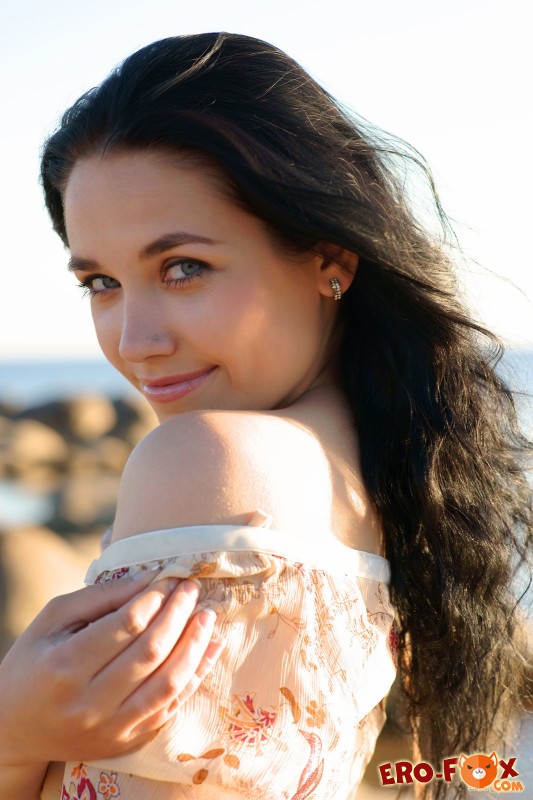 Симпатичная плоская девушка скидывает лишнюю одежду и начинает эротично позировать голенькой на пляже, стараясь демонстрировать маленькую грудь с торчащими сосками крупным планом. Для этого крошка в дальнейшем забирается на камни и ложась на спинку закидывает руки за голову и грациозно раздвигает промежность, что так же позволяет рассмотреть бритую киску с гладеньким лобком.