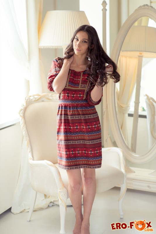 Медленно и как можно элегантнее стянув платье, привлекательная девушка со стройной фигурой и маленькими сиськами устраивается на стульчике и повернувшись спинкой в позе раком засвечивает сочную попочку. В процессе красотке с вьющимися локонами удается продемонстрировать не только упругие ягодицы, но и немного засветить гладенькую киску.