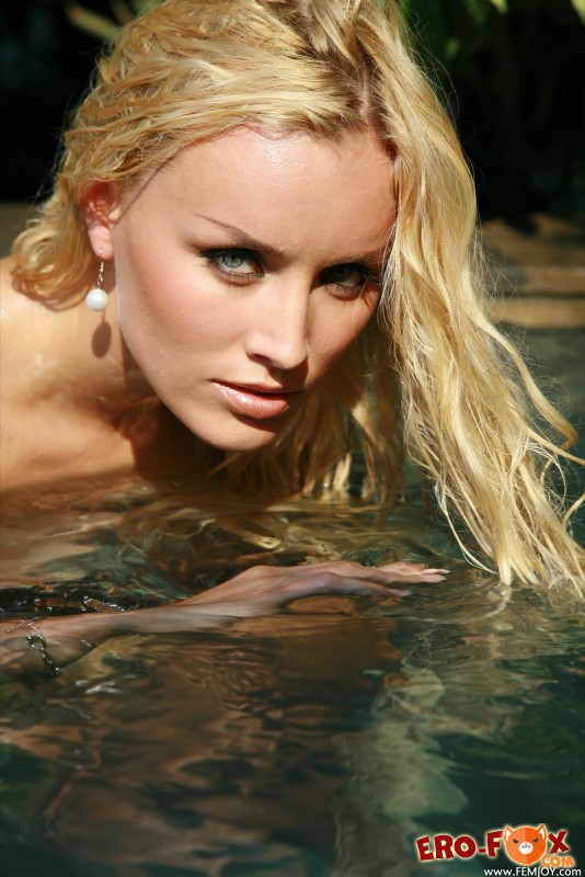 Полностью голая и невероятно сексуальная блондинка со спортивным телосложением купается в небольшом бассейне, пока её друг делает восхитительные снимки мокрой красавицы. В процессе съёмки очаровательная девушка с маленькой грудью старалась раздвигать свои стройные ноги и поворачиваться сочной попкой к фотографу, демонстрируя при этом гладко выбритую письку.