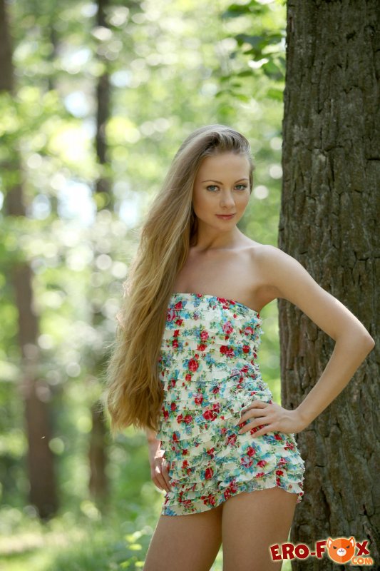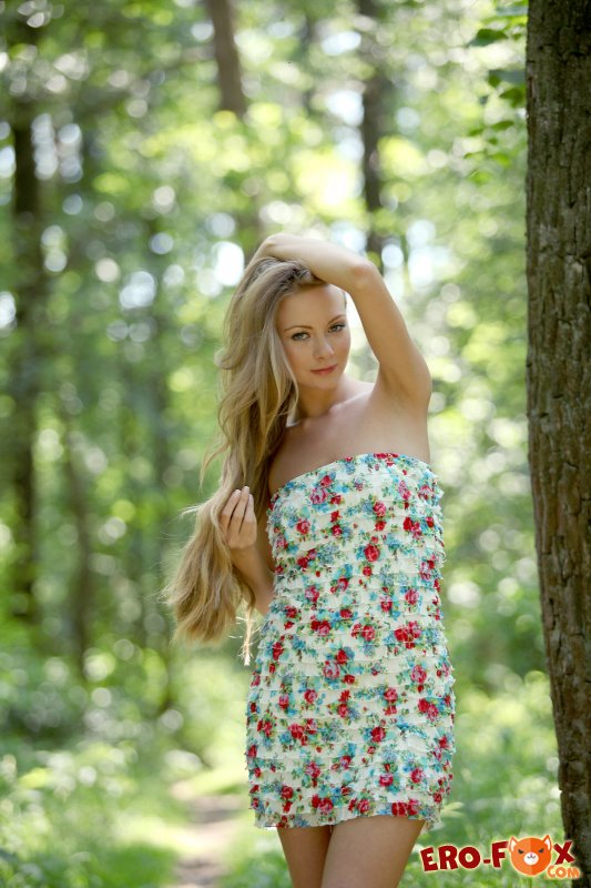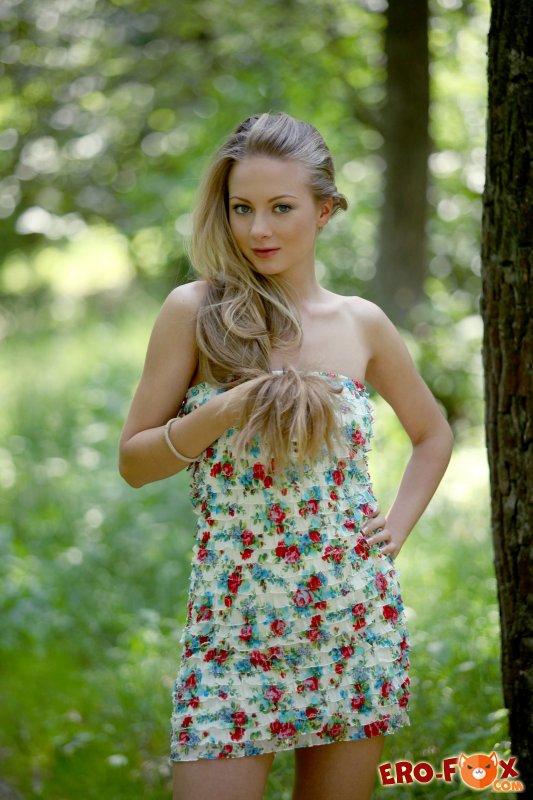 Обольстительная и красивая блондинка с упругим телом сняла лёгкое летнее платье в густом лесу, где голая позировала перед фото камерой. Красавица показала все свои прелести - небольшую грудь, попку и сочную киску, возбуждая зрителя и пробуждая к себе бурное желание и страсть... После таких фото хочется чаще гулять по лесу...