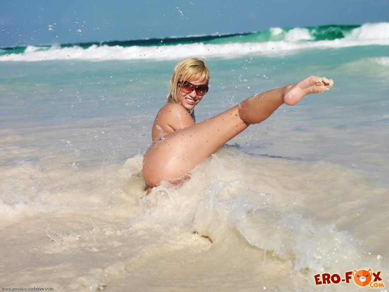 Полностью голая грудастая девка в очках стоит раком на пляже и грациозно прогибает спинку пока волны прибоя ласкают её соблазнительное тело. Вскоре очаровательная блондинка очень подробно демонстрирует перед камерой сочную задницу с возбуждающими ягодицами и не забывает показать нам побритую письку.