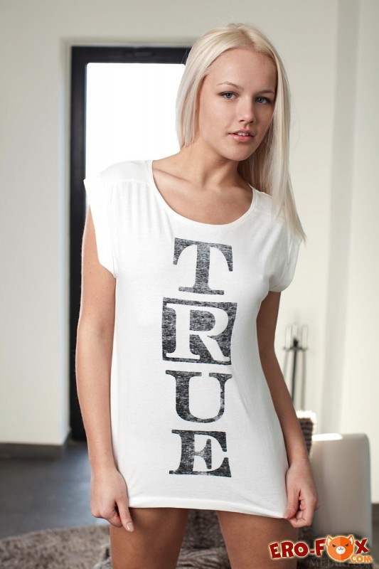 Симпатичная молоденькая блондинка в майке и белых трусиках, возбуждающе приоткрывая ротик, начинает позировать и медленно оголятся в спальне. В будущем полностью раздетая стройная девушка располагается на полу, где подробно демонстрирует маленькие сиськи с гладко выбритой писькой и плоским животиком, параллельно чередуя разные позы.