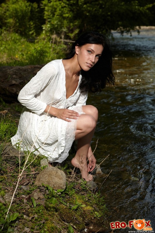 Обнажившись на берегу, сексуальная и совершенно голая деревенская девушка купается в речке, обливая своё стройное тело прохладной водицей, которая прекрасно освежает в жаркий летний денёк. При этом, брюнетка не стесняется демонстрировать себя перед фотокамерой, охотно принимая откровенные позы и позволяя нам разглядеть её упругую маленькую грудь, подтянутую попку и бритую киску.