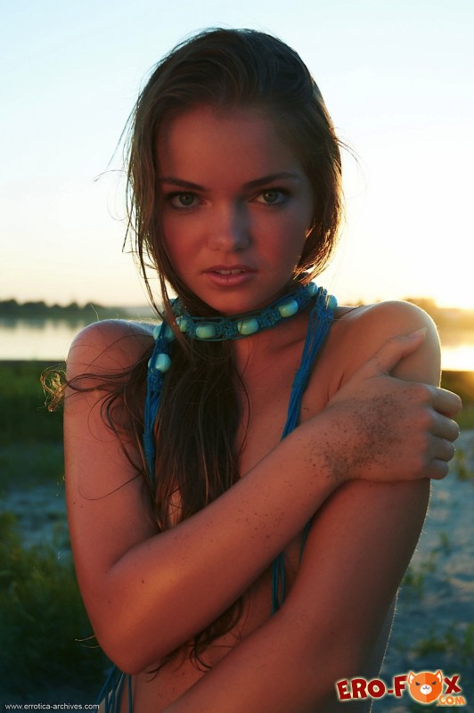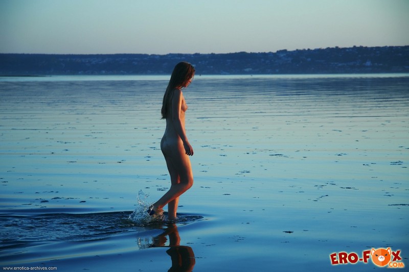 Голая молодая девушка со стройным и грязным от песка сексуальным телом показала маленькие сиськи на природе, а уже спустя несколько минут отправилась купаться в речку. Зайдя в воду по пояс и показав попку, обворожительная шатенка намочила гладко выбритую письку, нежно трогая её руками.