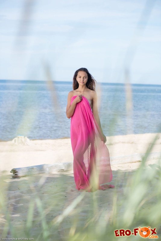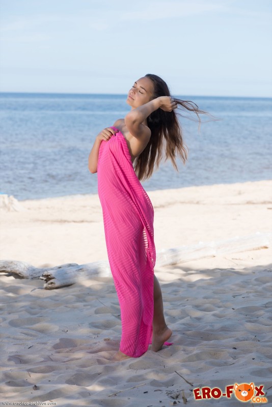Принимая солнечные ванны на пляже, прикрывая при этом сексуальное тело платком, голая девушка соблазнительно позирует на камеру. Вскоре молодая красотка располагается на песке и подробно демонстрирует возбуждающую упругую грудью, а поднимая ножки и немного раздвигая их, она засвечивает бритую письку.