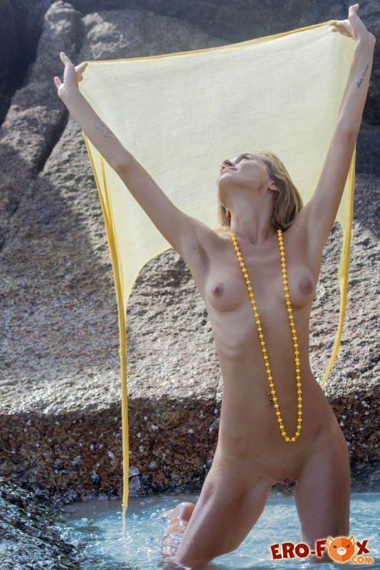 Обворожительная, молодая блондинка со стройной фигурой, прикрываясь мокрым платком, соблазнительно купается в голубом озере, при этом, голая красотка демонстрирует нам сексуальное тело. Чередуя разные ракурсы, худышка с натуральными сиськами, особенно часто засвечивала гладенькую, влажную письку и плоский животик.