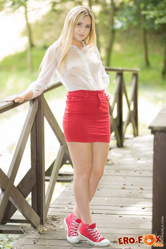 Молодая и весьма милая девушка со светлыми волосами, нарядившись в короткую юбку и полупрозрачную блузку прогуливается по улице, а остановившись на мосту, она позирует перед камерой и с охотой демонстрирует сексуальное, совершенно голое тело. В процессе съёмки, невысокая блондинка с маленькой грудью вставала раком и раздвигала ноги, показывая попку и бритую письку.