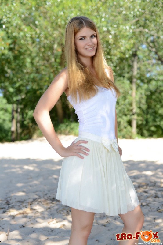 Сбросив платье, кружевные трусики белого цвета и лифчик, молодая девушка с большой попкой позирует на природе, голая демонстрируя свои прелести. Помимо славной попки, красотка позволила взглянуть на её соблазнительную бритую киску, а так же грудь небольшого размера.