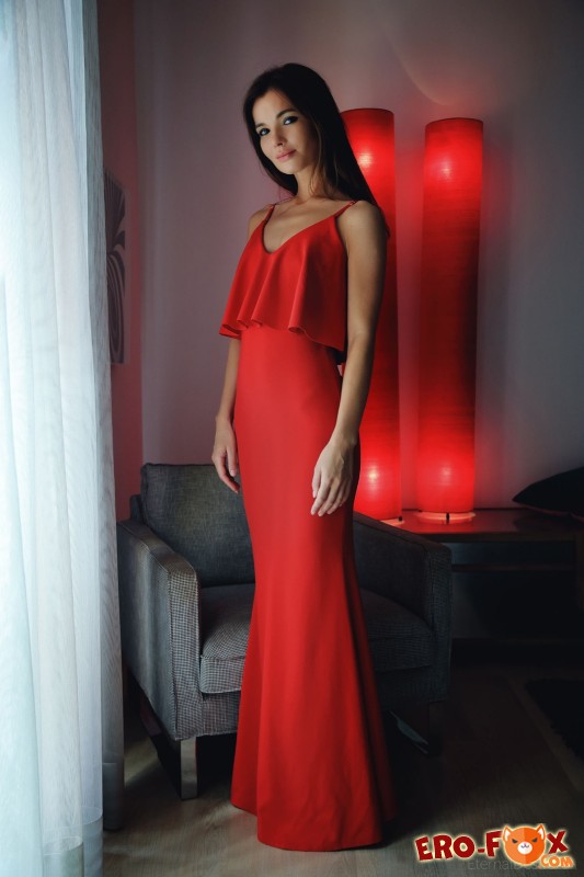 Обворожительная брюнетка с накрашенными газами, стоя у окна скидывает длинное платье и в дальнейшем эротично позирует в кресле. Перед стройняшка продемонстрировала нам красивую спинку с попой, а теперь раздвигала ноги засвечивая возбуждающею гладко выбритую письку, параллельно обхватывая маленькие сиськи руками.