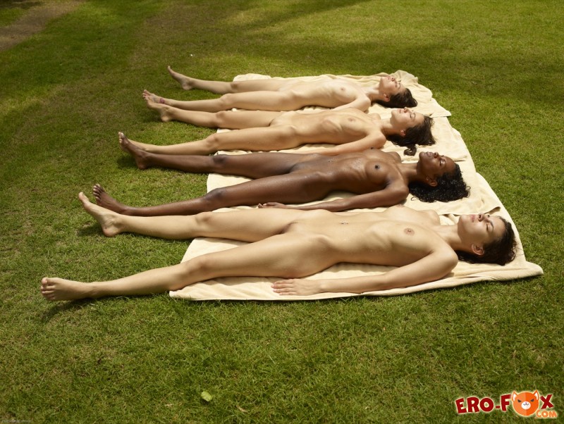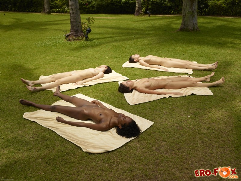 Привлекательные голые девушки, чернокожие и белые, загорают в парке на зелёной лужайке, наслаждаются свежим воздухом и в это же время показывают нам свои сексуальные тела. Стройные красавица не постеснялись продемонстрировать упругие титьки не большого размера, подтянутые попки и гладко выбритые киски от которых сложно оторвать взгляд...